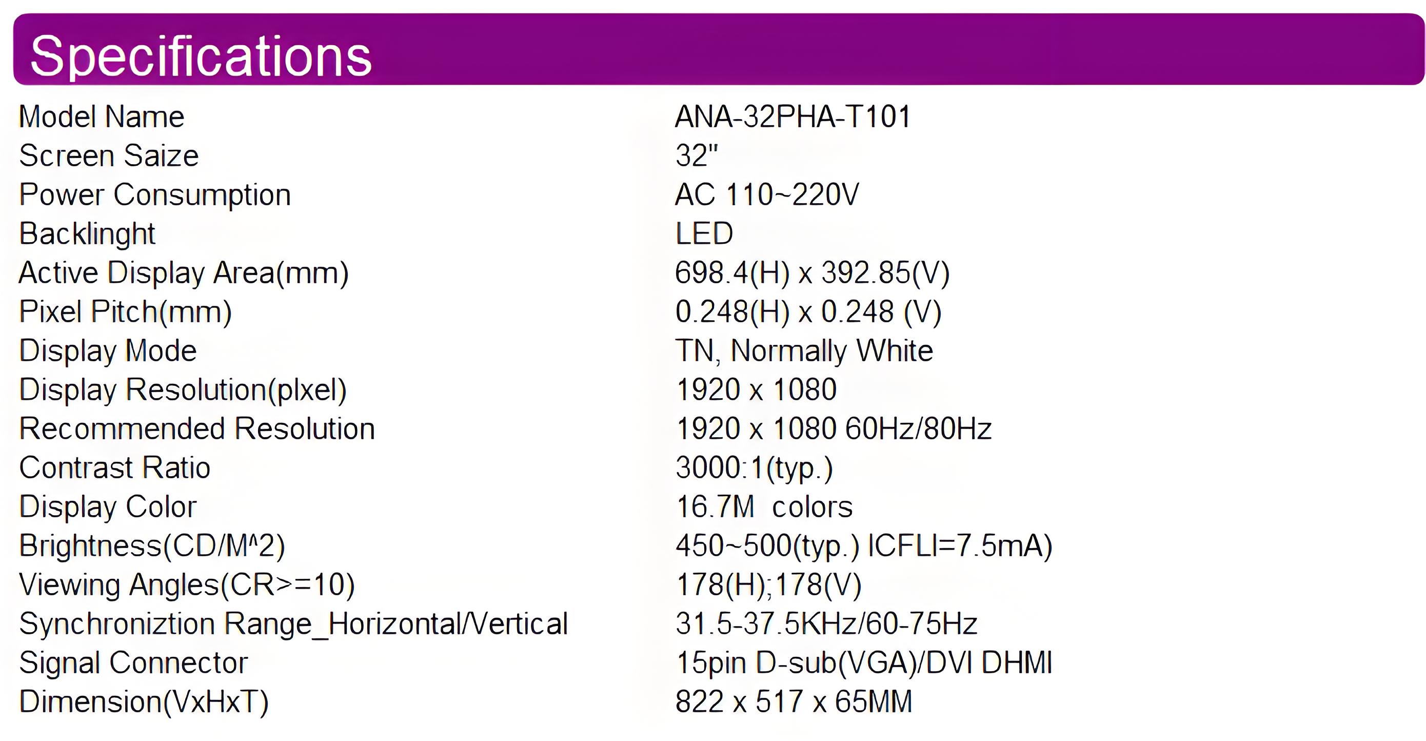 Product features: Size: 32 inches Resolution: 1920X1080 (16:9); Viewing angle: 89/89/89 (L/R/U/D) (full viewing angle); Color: 16.7M; Brightness: ≥ 500cd/㎡; Response time: 5ms. Working temperature: 0~60C Touch points: 10 points
